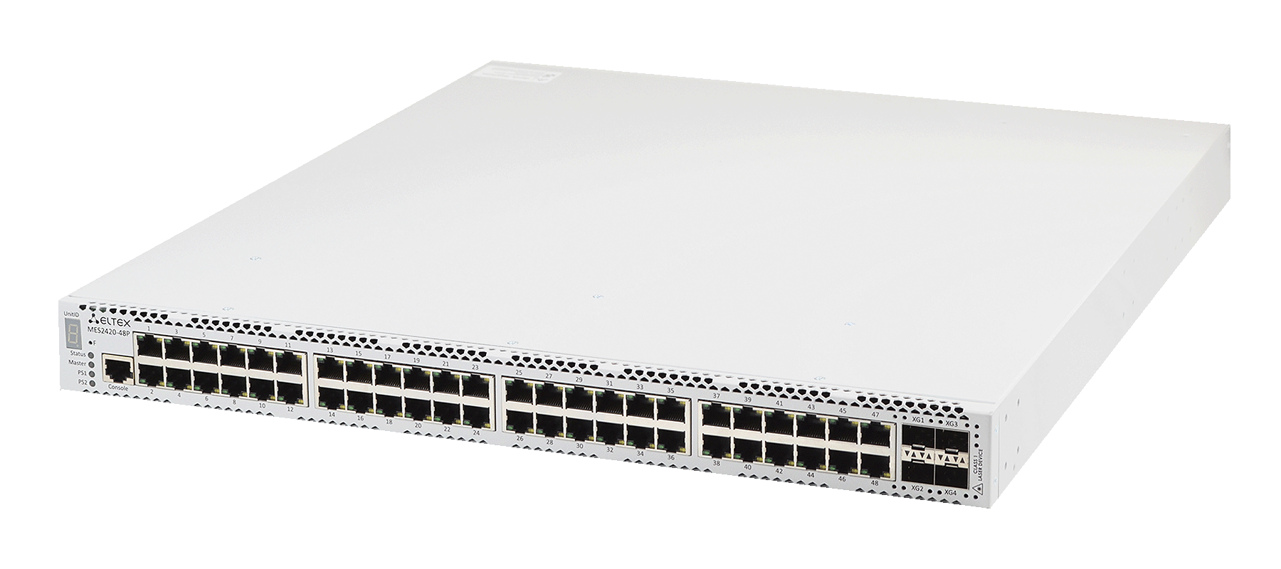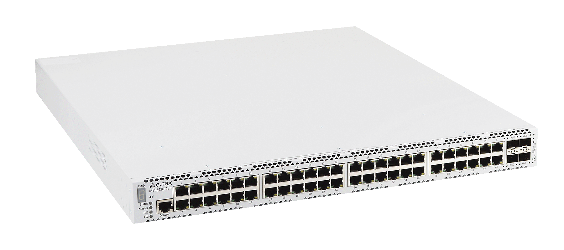 Коммутаторы MES2420-48P c поддержкой PoE осуществляют подключение конечных пользователей к сетям крупных предприятий, предприятий малого и среднего бизнеса, а также к сетям операторов связи с помощью интерфейсов 1G/10G.