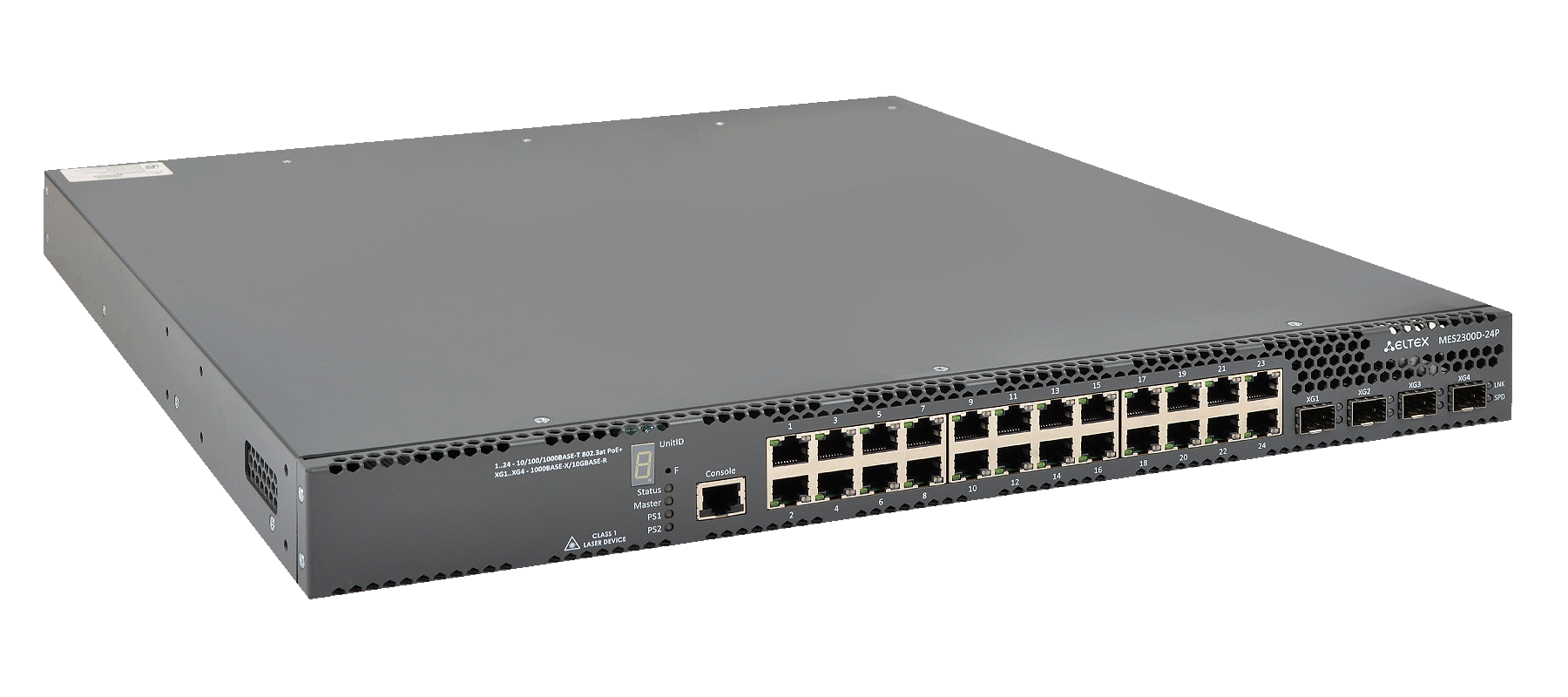 Коммутаторы MES2300D-24P с поддержкой PoE осуществляют подключение конечных пользователей к сети крупных предприятий, предприятий малого и среднего бизнеса и к сетям операторов связи с помощью интерфейсов 1G/10G.