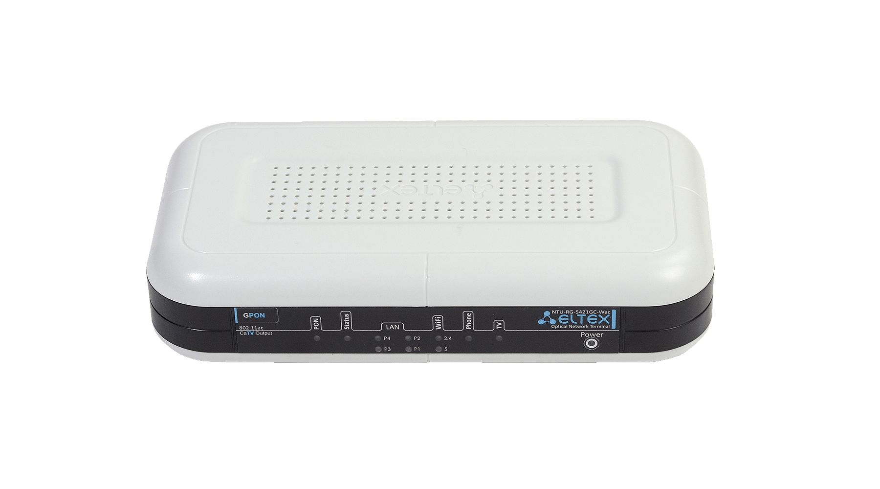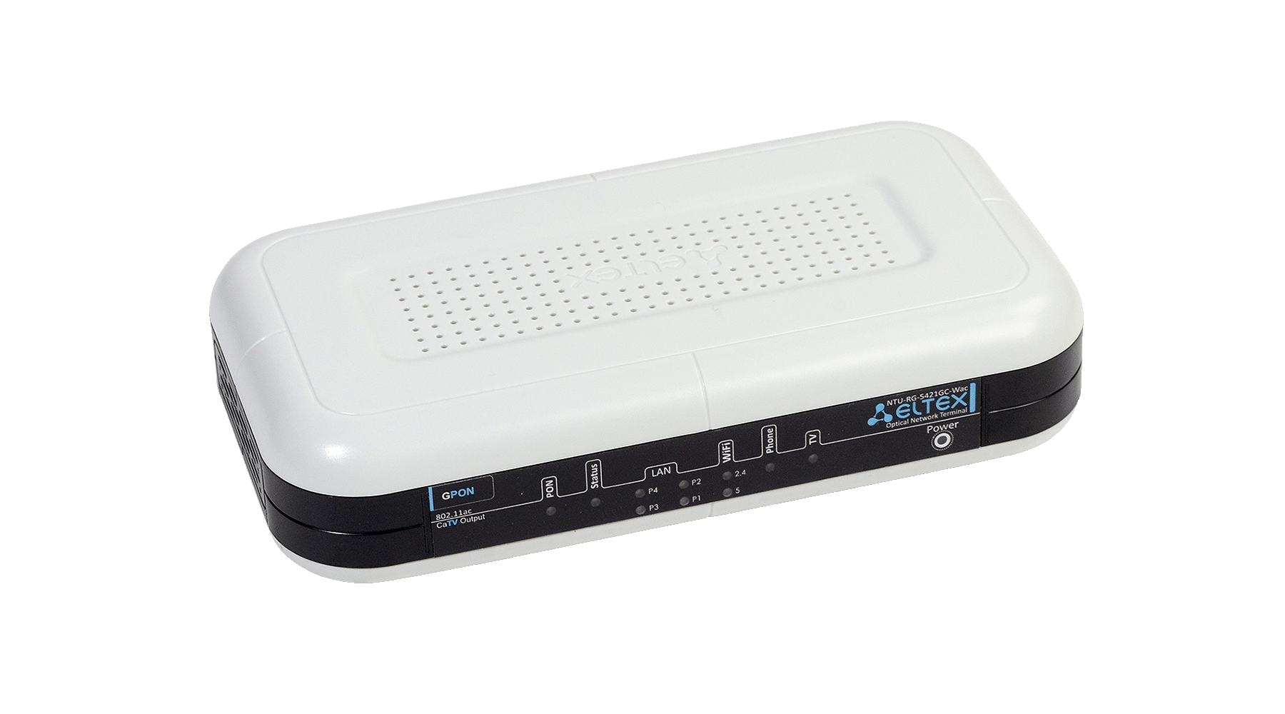 Высокопроизводительный многофункциональный абонентский терминал NTU-RG-5421GС-Wас предназначен для доступа к современным услугам IPTV, OTT и высокоскоростному интернету. Благодаря стандарту 802.11ac скорость передачи данных может достигать до 866 Мбит/с, а два встроенных контроллера Wi-Fi сети обеспечивают работу устройства одновременно в двух частотных диапазонах — 2.4 ГГц и 5 ГГц.