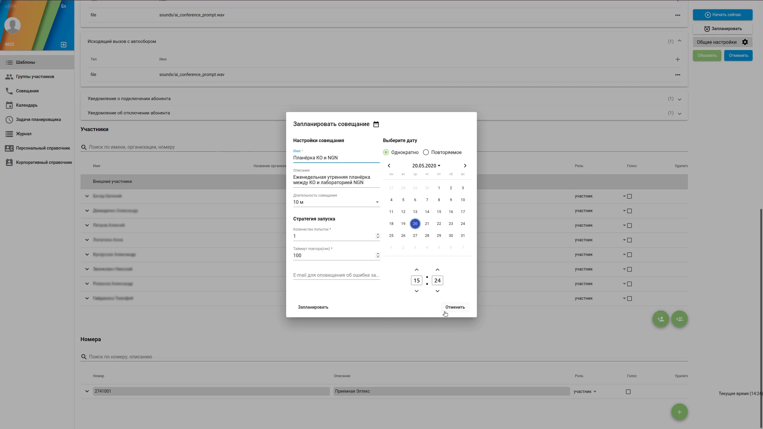 - Планирование времени автоматического сбора совещания