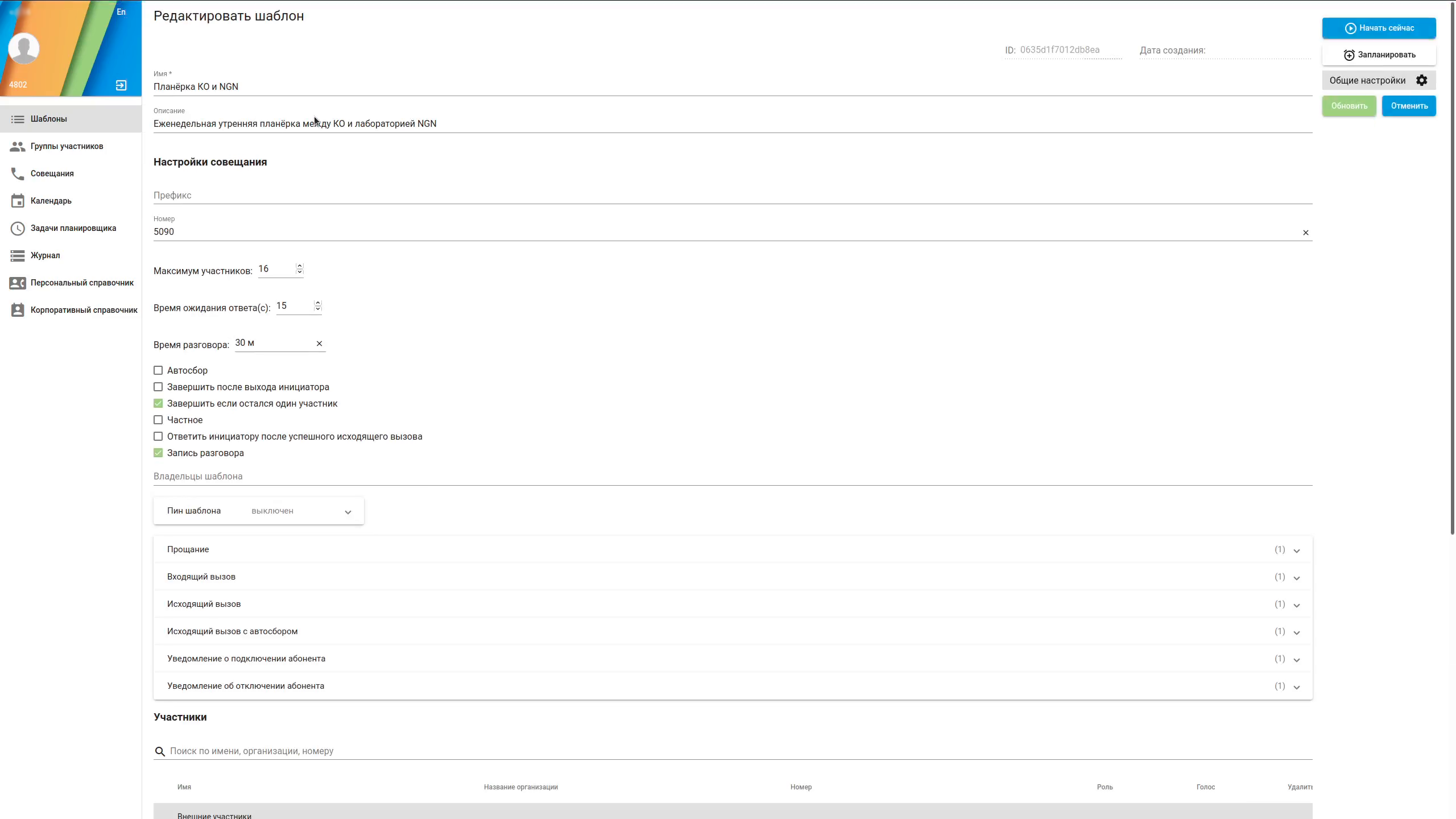 - Создание шаблона совещания