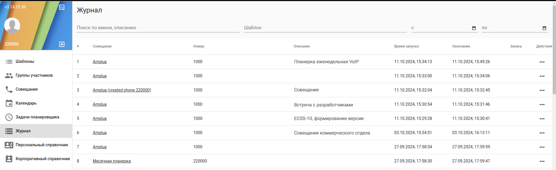 - Просмотр истории завершенных совещаний