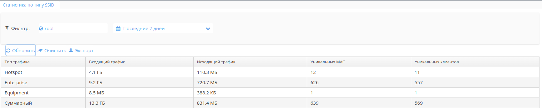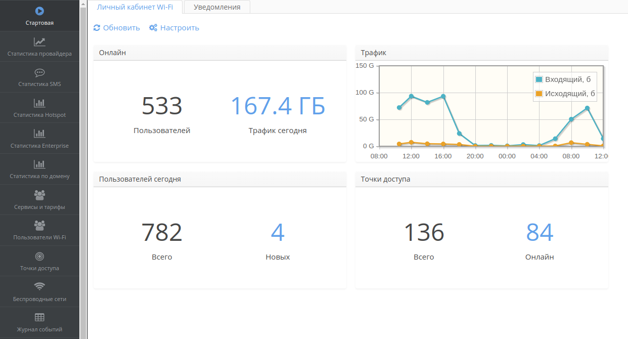 - Статистика работы сети: трафик, время сессий, типы устройств и т. д.