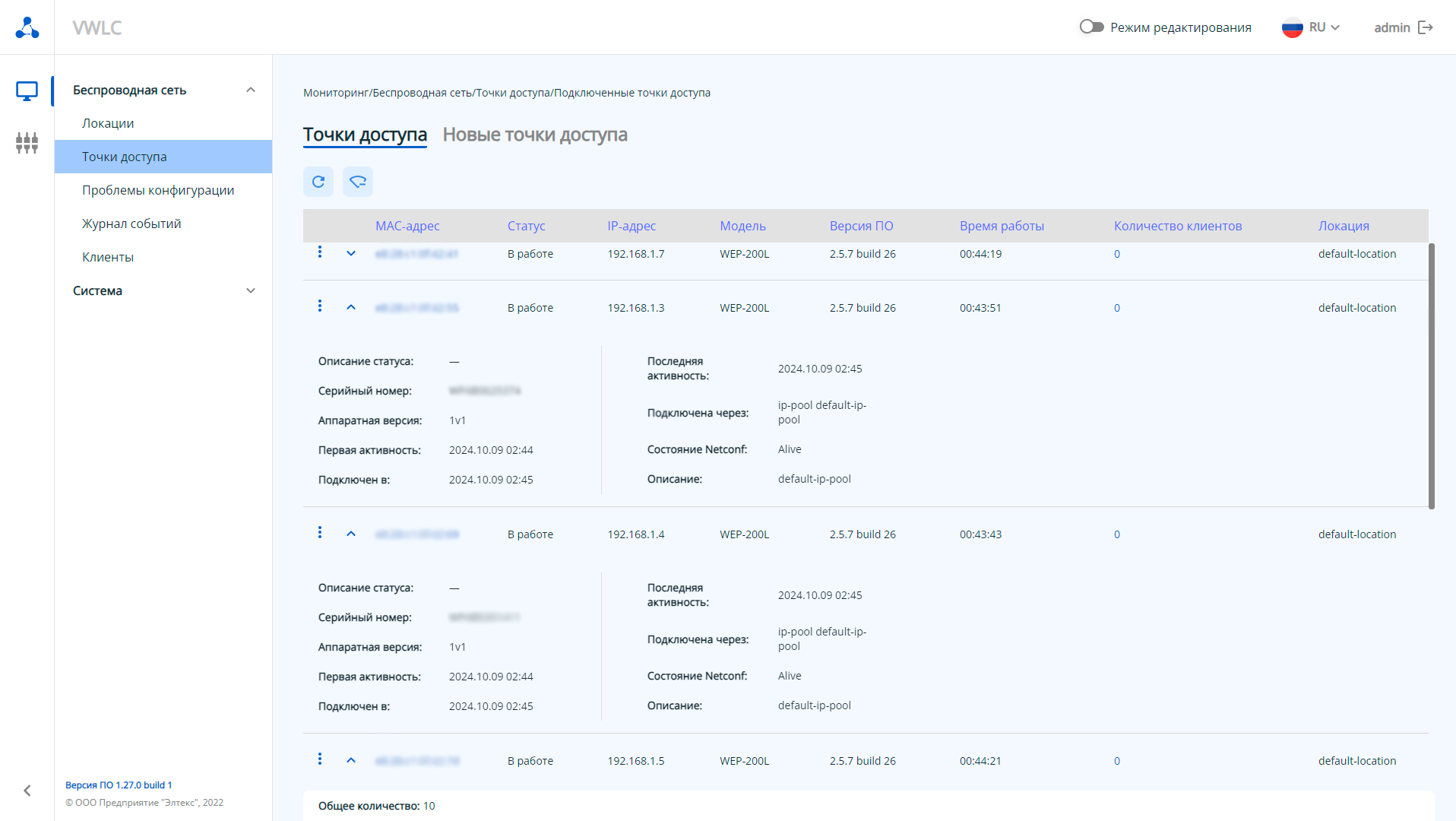 Доступно расширение числа точек доступа по лицензии до 5000.