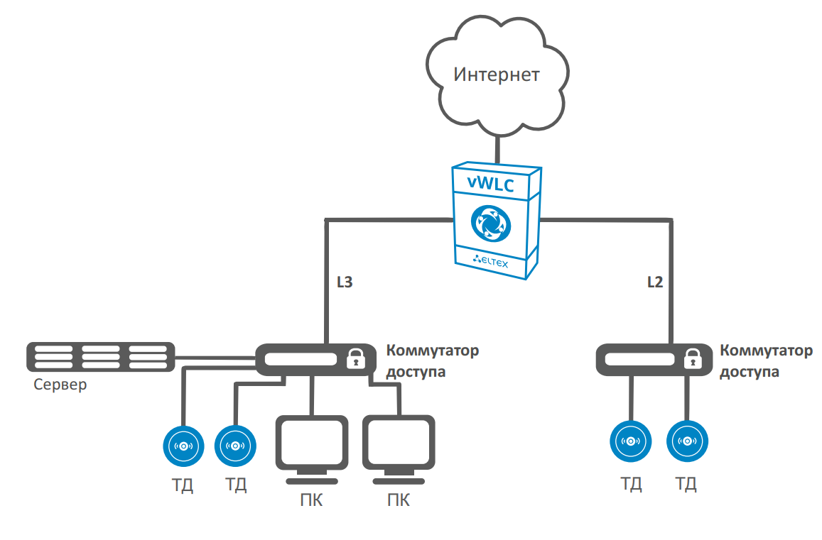 vWLC – программный контроллер беспроводного доступа для построения корпоративных сетей на крупных предприятиях. Одним из ключевых преимуществ решения является встроенный программный маршрутизатор, который позволяет обеспечить реализацию прохождения клиентского (data) трафика и трафика управления (management) на уровне L2 и L3, а также функции межсетевого экранирования для корпоративной сети.