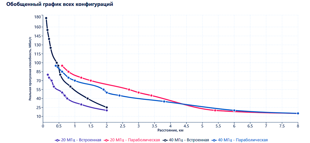 В режиме 40 МГц результаты ещё лучше: 280 Мбит/с (MCS11) на расстоянии 1 км и 100 Мбит/c (MCS5) – на 7 км.