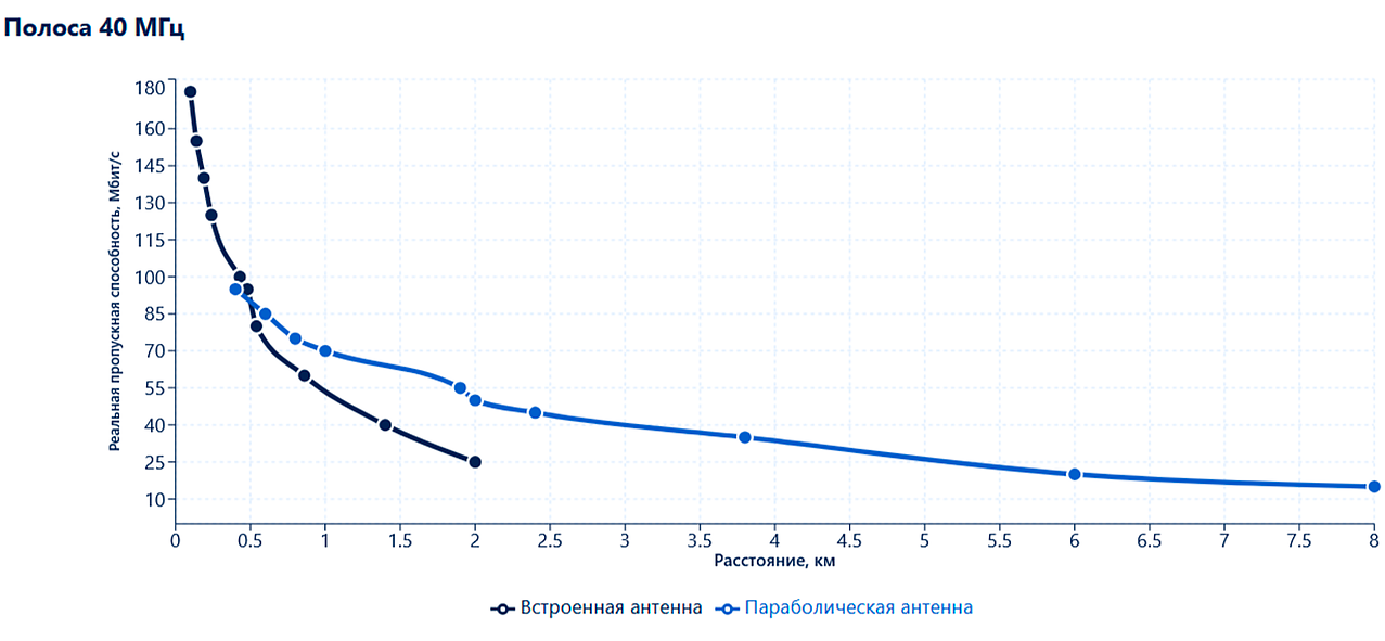 В режиме 40 МГц преимущества становятся более очевидными: 400 Мбит/с (MCS11) на дистанции 1 км и 145 Мбит/с (MCS4) на 7 км. При полной загрузке каждый из 64 клиентов получит от 2,3 до 6,25 Мбит/с гарантированной пропускной способности в зависимости от расстояния размещения.