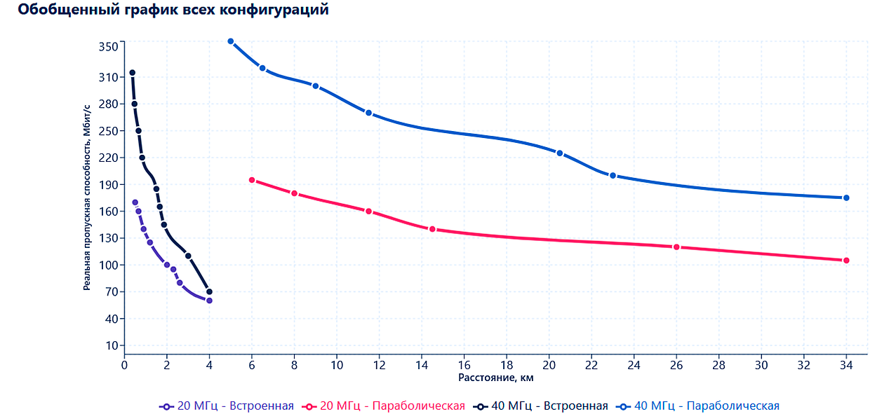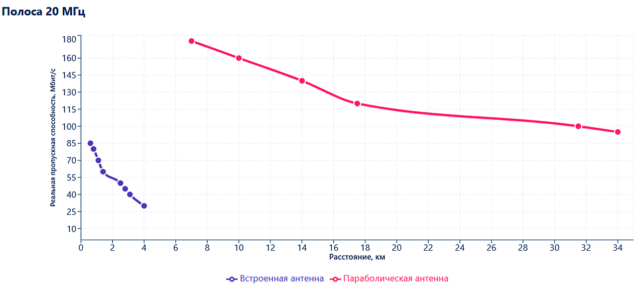 С параболической антенной в полосе 20 МГц на максимальной дальности тестирования 34 км реальная пропускная способность составила 105 Мбит/с (MCS6) – более 80 % от лабораторных 120 Мбит/с для данной схемы модуляции.