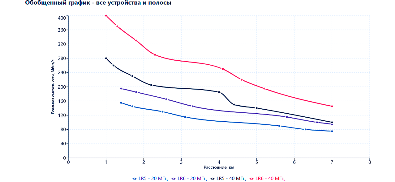 Оборудование диапазона 6 ГГц показало лучшие результаты по ёмкости сети. В полосе 20 МГц реальная ёмкость достигает 195 Мбит/с (MCS11) на расстоянии 1,4 км и остаётся на уровне 95 Мбит/с (MCS5) на дальности 7 км – на 27 % выше, чем у устройств 5 ГГц.