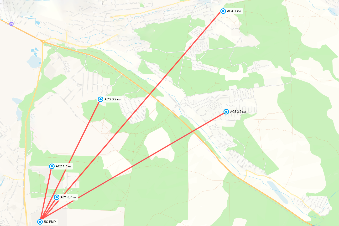 Тестовая зона в Подмосковье находится достаточно далеко от столицы, чтобы исключить влияние интенсивных городских радиопомех, но в то же время обеспечивает удобную логистику для инженерной команды. Рельеф местности выбирался с учётом условий: местность с перепадами высот, смешанные лесные массивы, есть открытые пространства и застройка разной этажности.