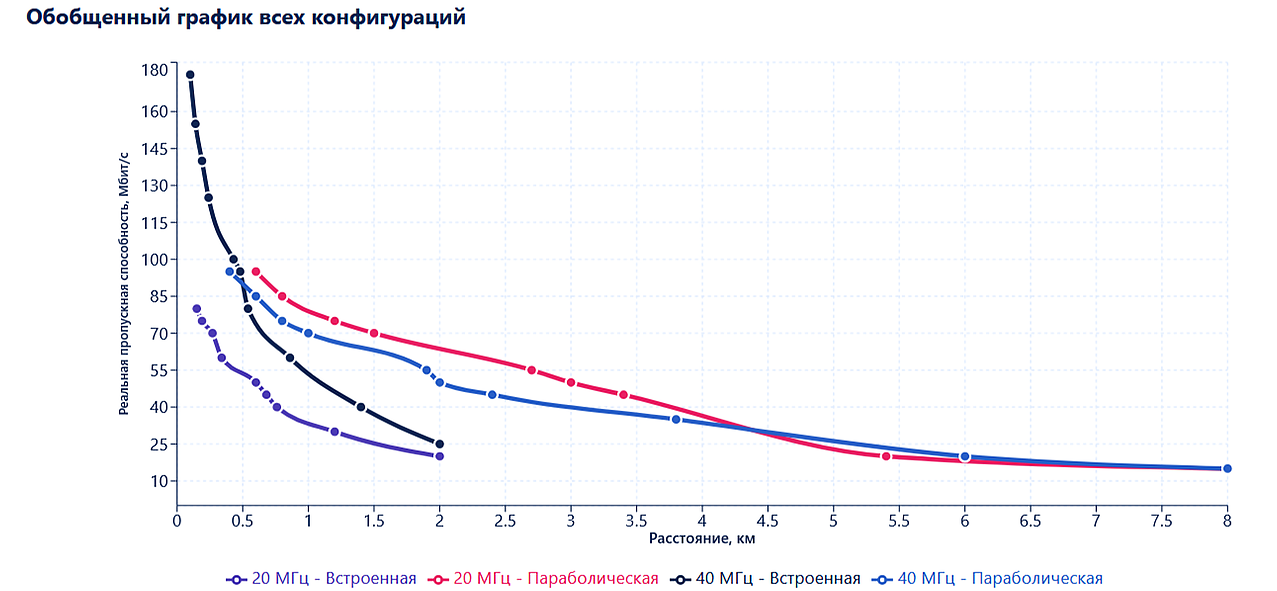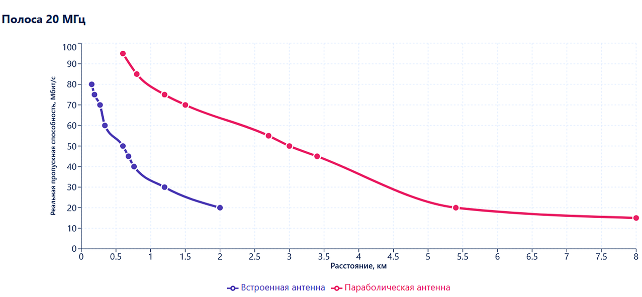 Например, в полосе 20 МГц для радиомоста 2.4 ГГц при использовании внутренней антенны на расстоянии 0,6 км соотношение лабораторной пропускной способности к реальной приблизительно 43 % (190 Мбит/c против 80 Мбит/с), для радиомоста 5 ГГц – 38 % (220 Мбит/c против 85 Мбит/c), а для радиомоста 6 ГГц – 77 % (220 Мбит/c против 170 Мбит/c). При этом для всех устройств при увеличении расстояния соотношение сглаживается.