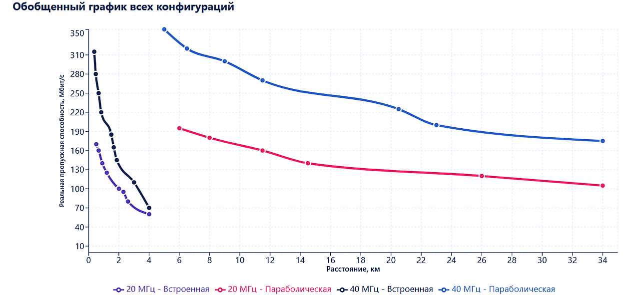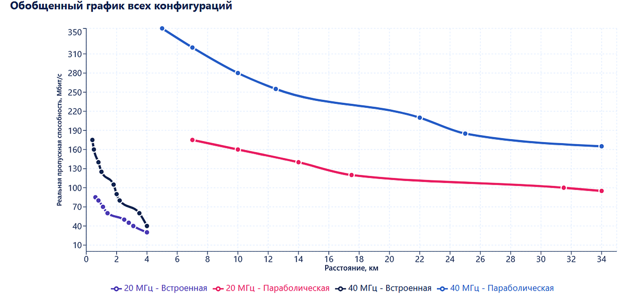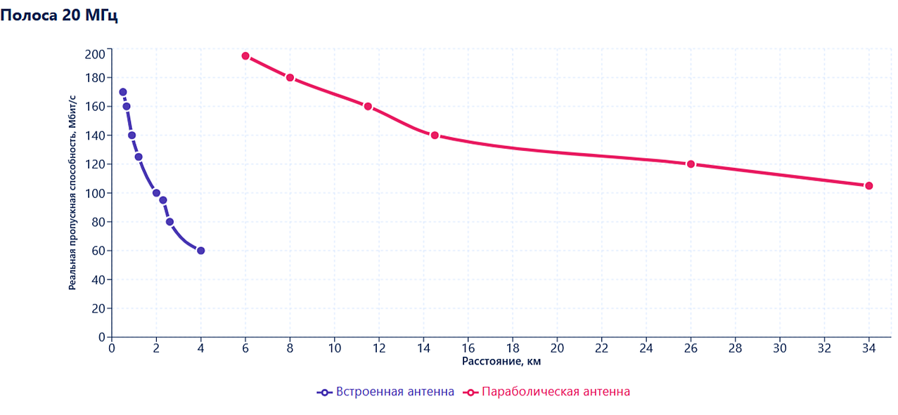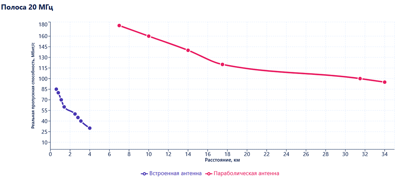 С параболической антенной в полосе 20 МГц на максимальной дальности тестирования 34 км реальная пропускная способность составила 105 Мбит/с (MCS6) – более 80 % от лабораторных 120 Мбит/с для данной схемы модуляции.