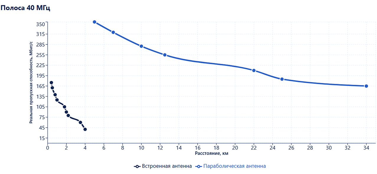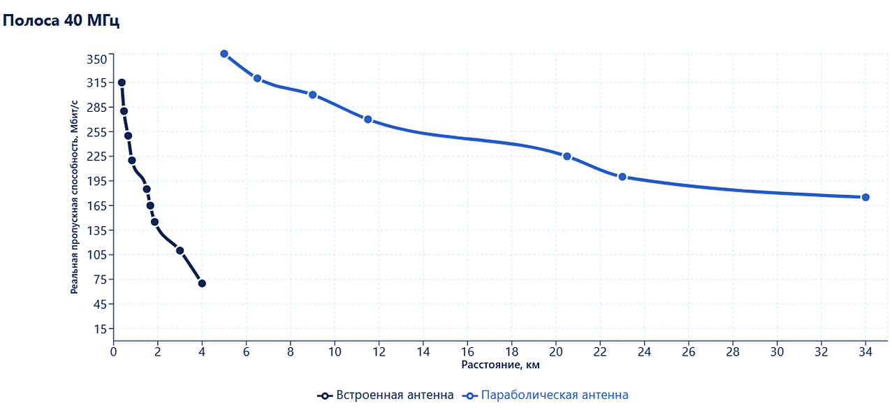 В полосе 40 МГц результаты ещё выше. При использовании встроенной секторной антенны на расстоянии 0,37 км реальная пропускная способность составила 315 Мбит/с (MCS11) – 70 % от лабораторного максимума в 450 Мбит/с. На расстоянии 4 км мост выдаёт 70 Мбит/с (MCS3) – 67 % от лабораторных 105 Мбит/с для этой схемы модуляции.
