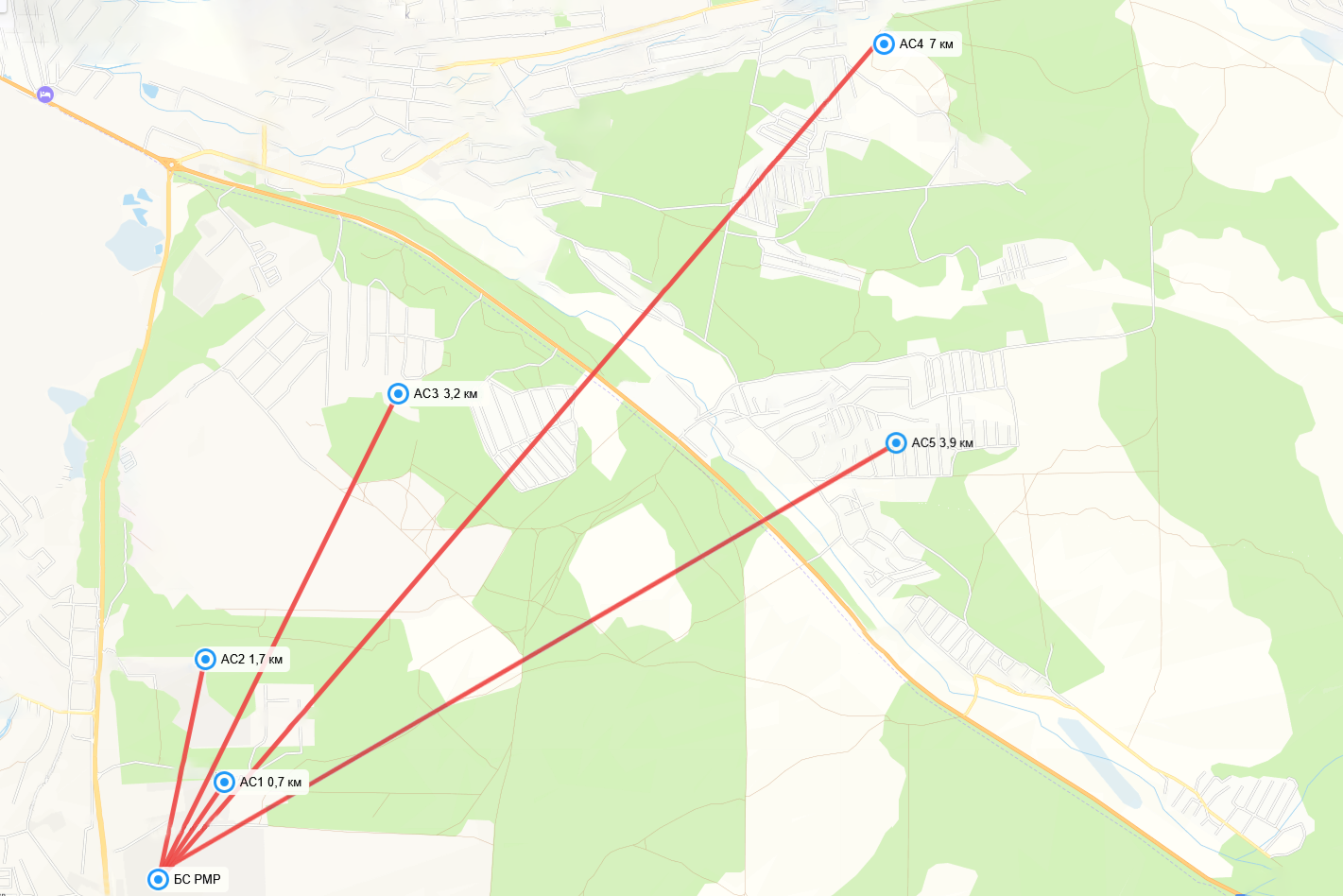 Тестовая зона в Подмосковье находится достаточно далеко от столицы, чтобы исключить влияние интенсивных городских радиопомех, но в то же время обеспечивает удобную логистику для инженерной команды. Рельеф местности выбирался с учётом условий: местность с перепадами высот, смешанные лесные массивы, есть открытые пространства и застройка разной этажности.