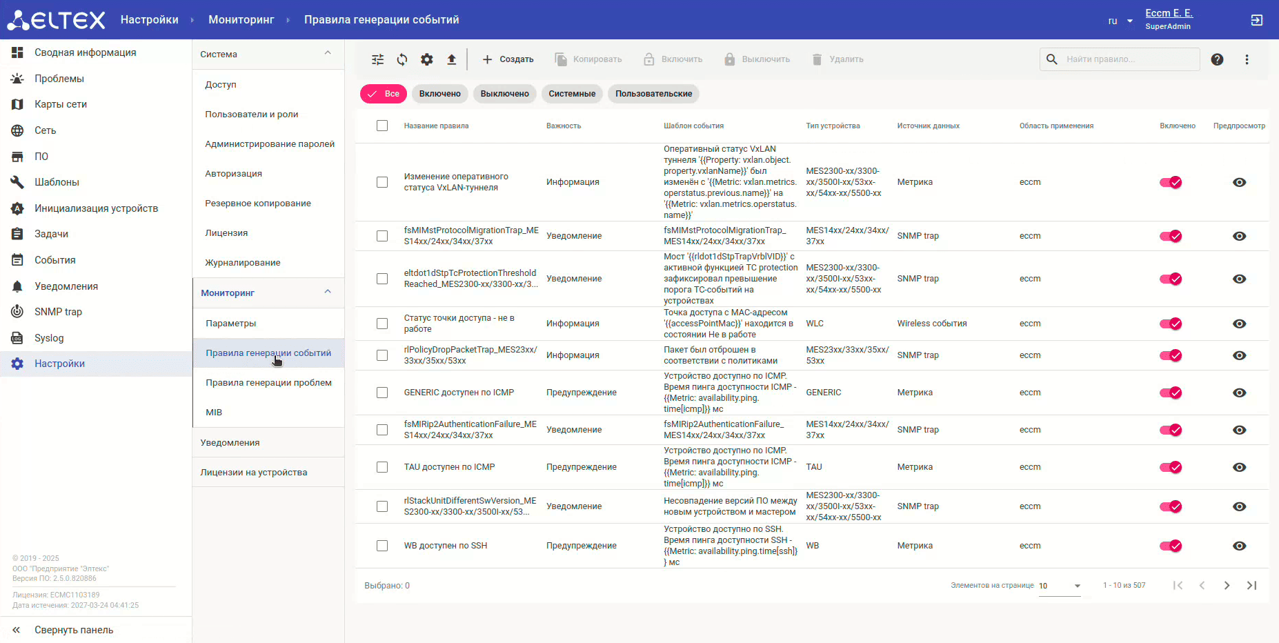 Мониторинг в ECCM – это не просто проверка доступности устройств по пингу. Система собирает детализированную информацию о состоянии элементов инфраструктуры. У коммутаторов, маршрутизаторов и другого оборудования Eltex есть специфические метрики, и ECCM учитывает это. Администратор видит не абстрактный универсальный объект, а оборудование со своим набором характерных параметров. Например: