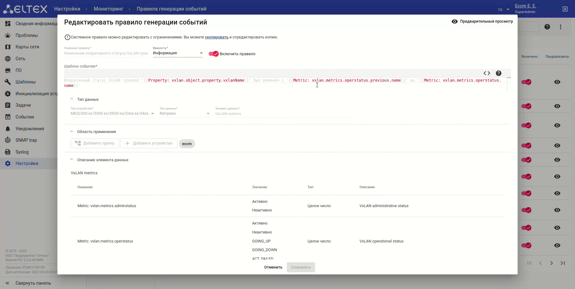 - Система обрабатывает сырые SNMP-трапы и syslog-сообщения, сопоставляя их с библиотекой шаблонов, которые описывают типовые проблемы и события. В ECCM предустановлено около 600 шаблонов для разных ситуаций. Администратор может их менять под собственные задачи или создавать новые с помощью мастера.