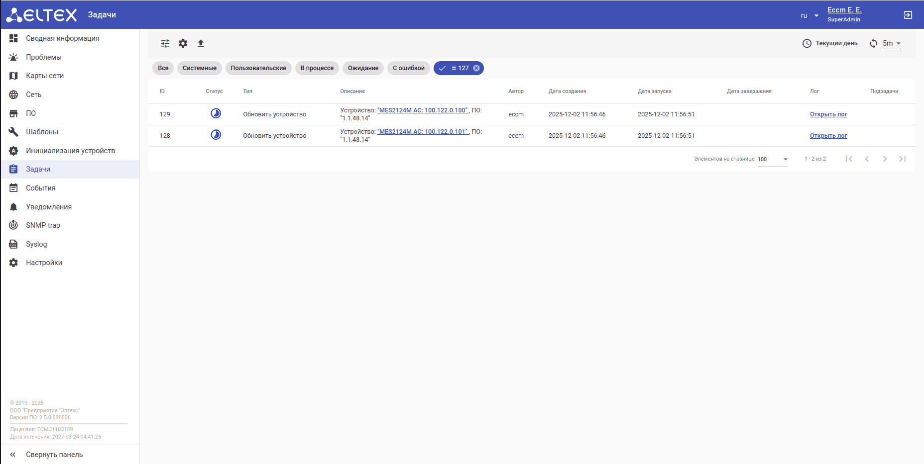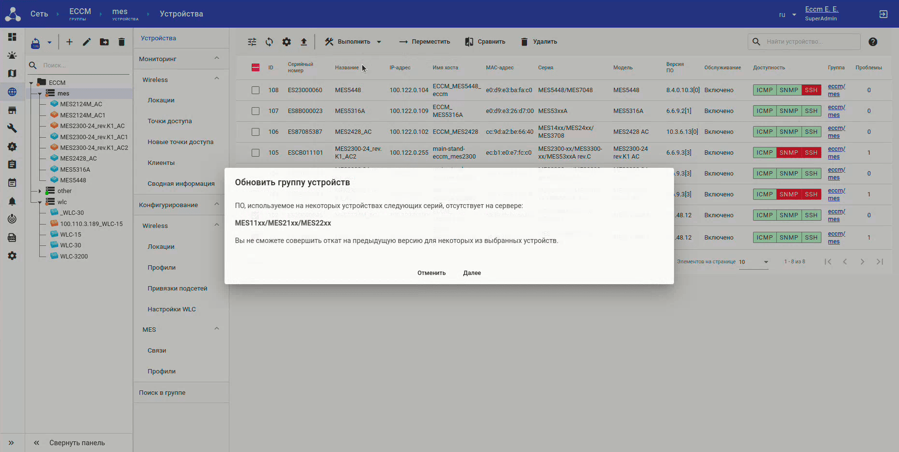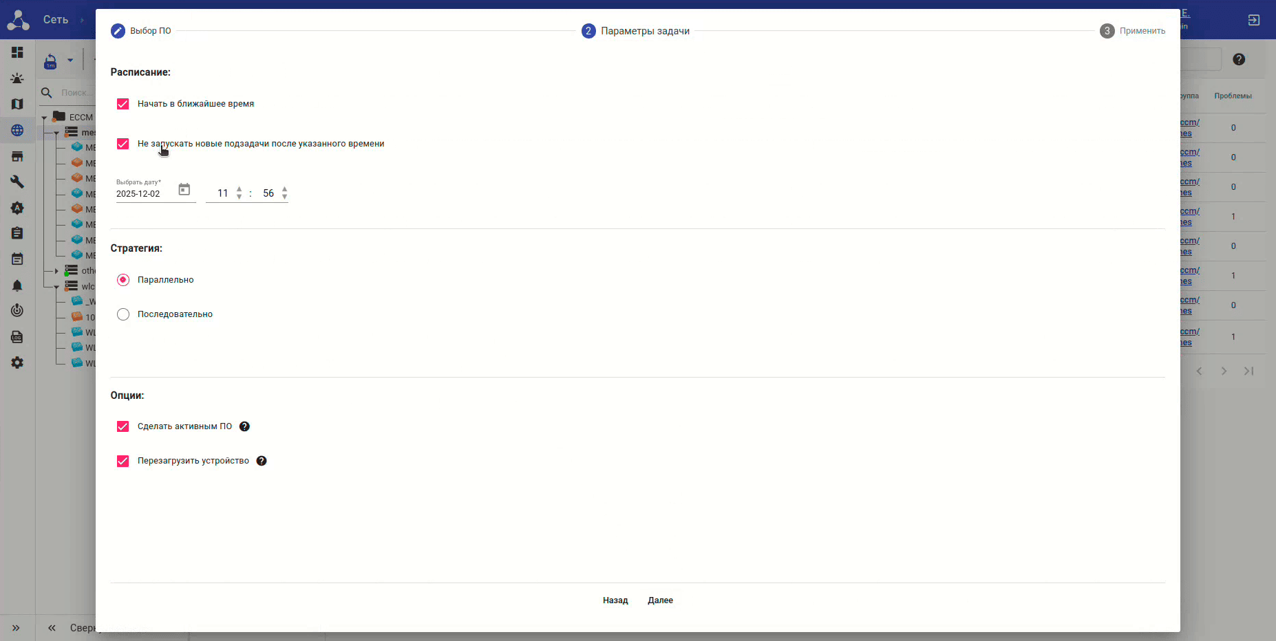 Система позволяет выбирать группы устройств, назначать им целевые версии ПО и задавать временные окна, когда это нужно сделать. Далее ECCM разносит образы, инициирует обновления, контролирует ход выполнения и фиксирует результат по каждому устройству. В интерфейсе видно, какое оборудование уже обновлено, где процесс ещё идёт, а где произошли ошибки и требуется вмешательство.