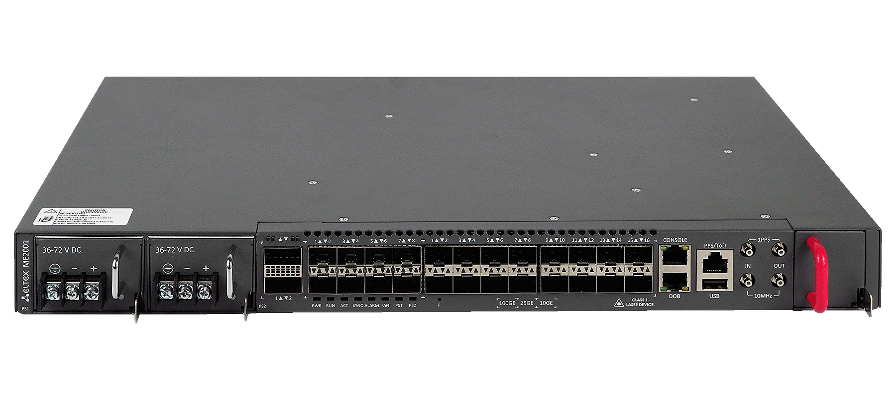 ME2001 – младшая модель линейки с фиксированным набором интерфейсов, производительность – до 300 Гбит/с. Она подойдёт для маршрутизации на уровне доступа IP/MPLS-сети: точка стыка локальных L2/L3-сегментов с магистралью, подключение базовых станций мобильных операторов, в том числе 5G, первичная маршрутизация трафика.