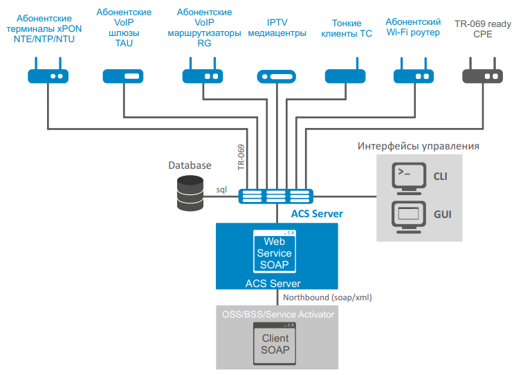 Π£ΠΏΡΠ°Π²Π»Π΅Π½ΠΈΠ΅ ΡΠ΅ΡΠ²Π΅ΡΠΎΠΌ ACS Π΄ΠΎΡΡΡΠΏΠ½ΠΎ ΡΠ΅ΡΠ΅Π· ΠΈΠ½ΡΠ΅ΡΡΠ΅ΠΉΡ NorthBound, ΡΡΠΎ Π΄Π°ΡΡ Π²ΠΎΠ·ΠΌΠΎΠΆΠ½ΠΎΡΡΡ ΠΏΠΎΠ»Π½ΠΎΡΠ΅Π½Π½ΠΎΠ³ΠΎ Π²Π·Π°ΠΈΠΌΠΎΠ΄Π΅ΠΉΡΡΠ²ΠΈΡ Ρ OSS. ΠΡΠΎ ΠΎΠ±Π΅ΡΠΏΠ΅ΡΠΈΠ²Π°Π΅Ρ Π²ΠΎΠ·ΠΌΠΎΠΆΠ½ΠΎΡΡΡ ΠΏΠΎΠ΄ΡΡΡΠΎΠΉΠΊΠΈ Π²ΡΠ΅Ρ