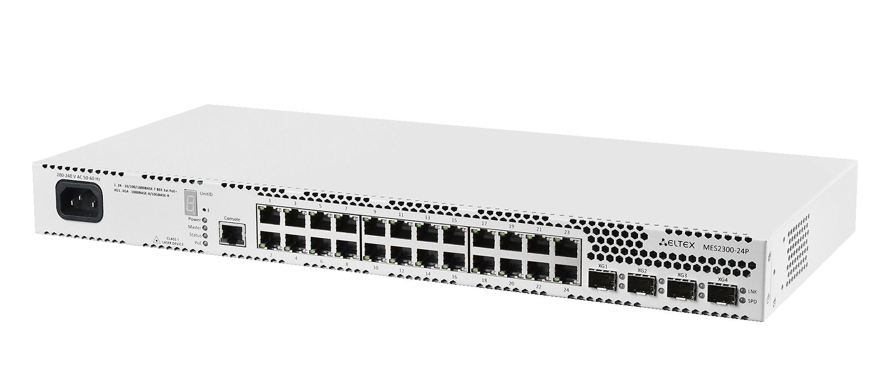 Коммутатор MES2300-24P с поддержкой PoE осуществляет подключение конечных пользователей к сети крупных предприятий, предприятий малого и среднего бизнеса и к сетям операторов связи с помощью интерфейсов 1G/10G. Функциональные возможности коммутатора обеспечивают физическое стекирование, поддержку виртуальных локальных сетей, многоадресных групп рассылки и расширенные функции безопасности.