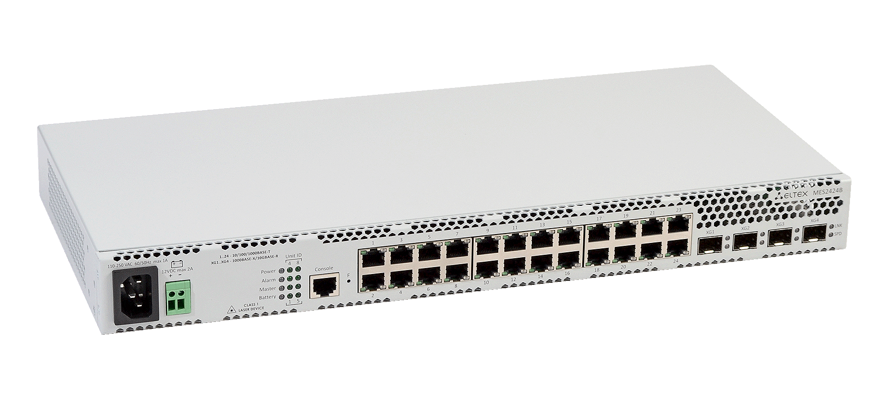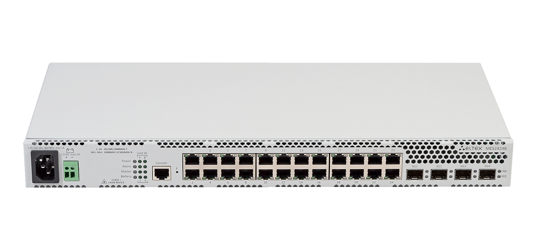 Коммутаторы MES2424B имеют возможность подключения аккумуляторной батареи для обеспечения гарантированного питания в случае пропадания первичной сети 220 В. Коммутатор оснащен блоком питания, который позволяет заряжать АКБ при наличии питания 220 В. Система резервного питания позволяет следить за состоянием первичной сети и извещать о переходе с одного типа питания на другой.