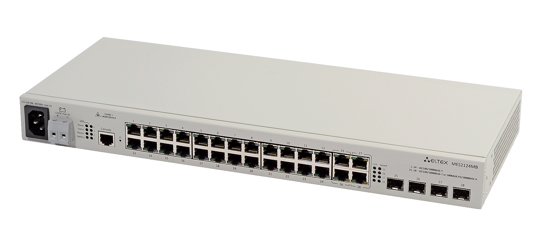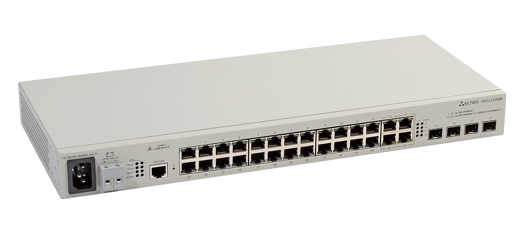 Коммутатор MES2124МВ подключает пользователей к сети крупных предприятий, предприятий малого и среднего бизнеса и к сетям операторов связи с помощью интерфейсов Fast и Gigabit Ethernet. Функциональные возможности коммутатора обеспечивают физическое стекирование, поддержку виртуальных локальных сетей, многоадресных групп рассылки и расширенные функции безопасности.