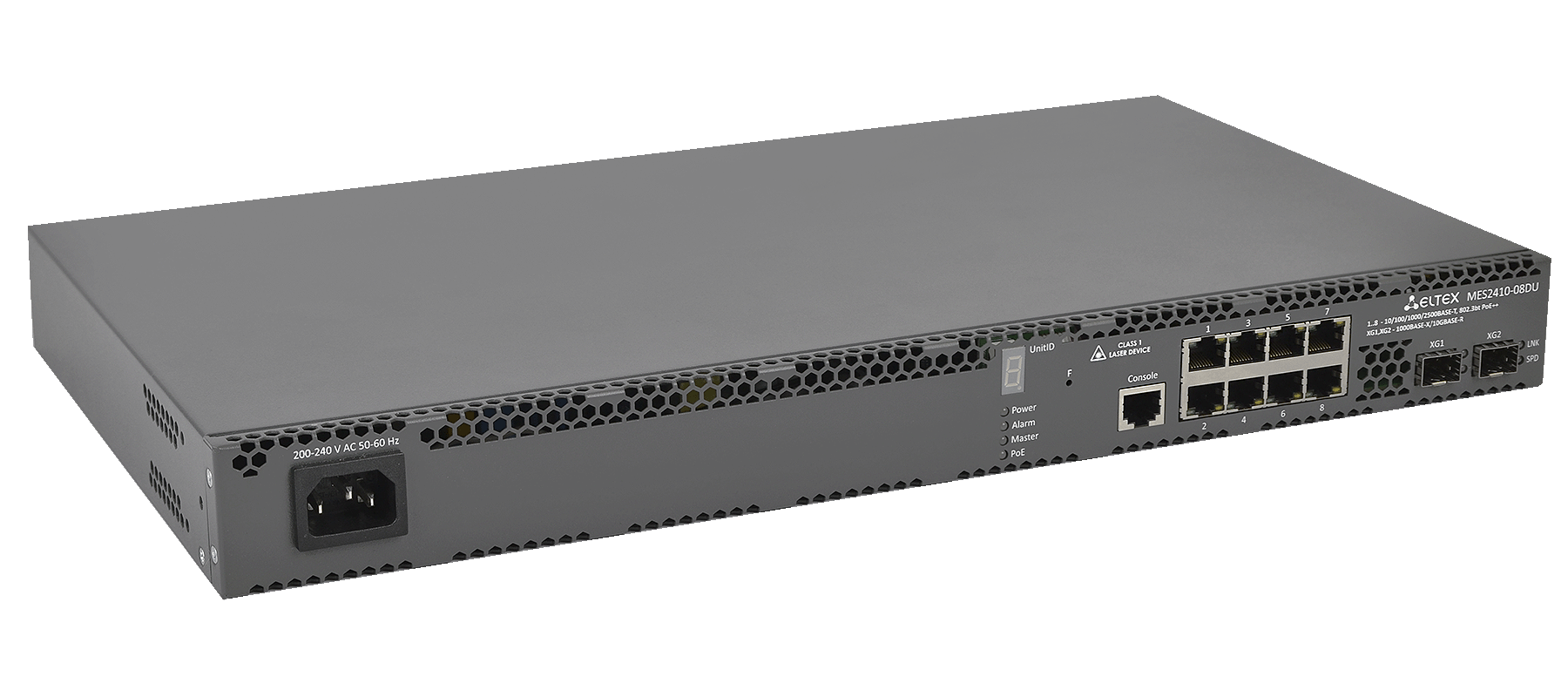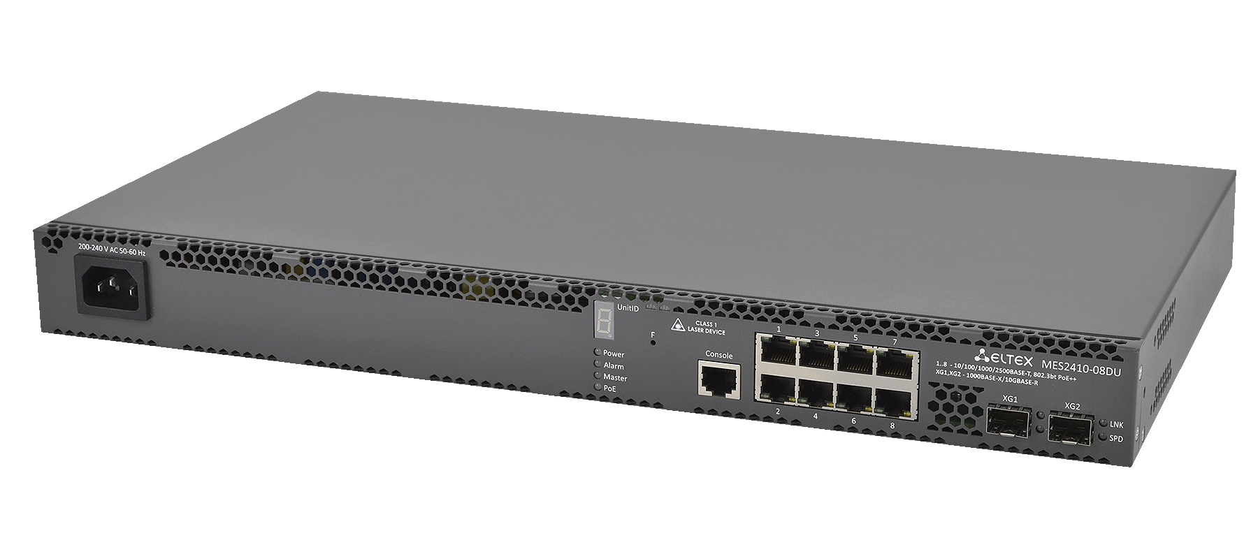 MES2410-08DU поддерживает работу PoE по стандарту IEEE 802.3bt/PoE++, что обеспечивает питание PoE до 90 Вт на порт. Коммутаторы поддерживают виртуальные локальные сети, многоадресные группы рассылки и имеют расширенный набор функций безопасности.