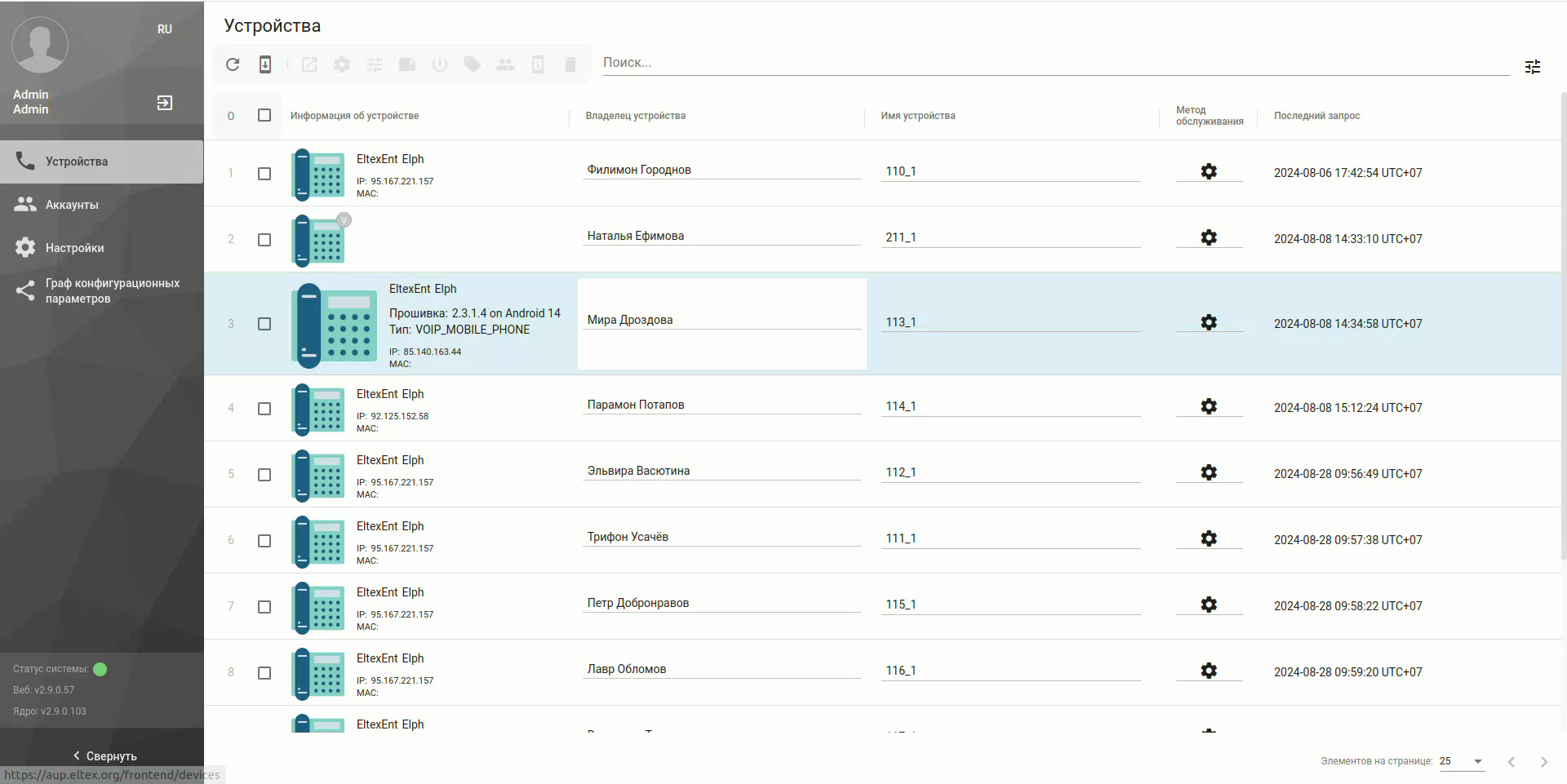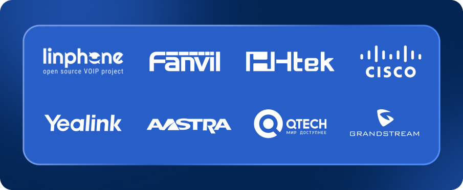 Поддерживает работу с телефонами Eltex, Yealink, Cisco и других производителей.